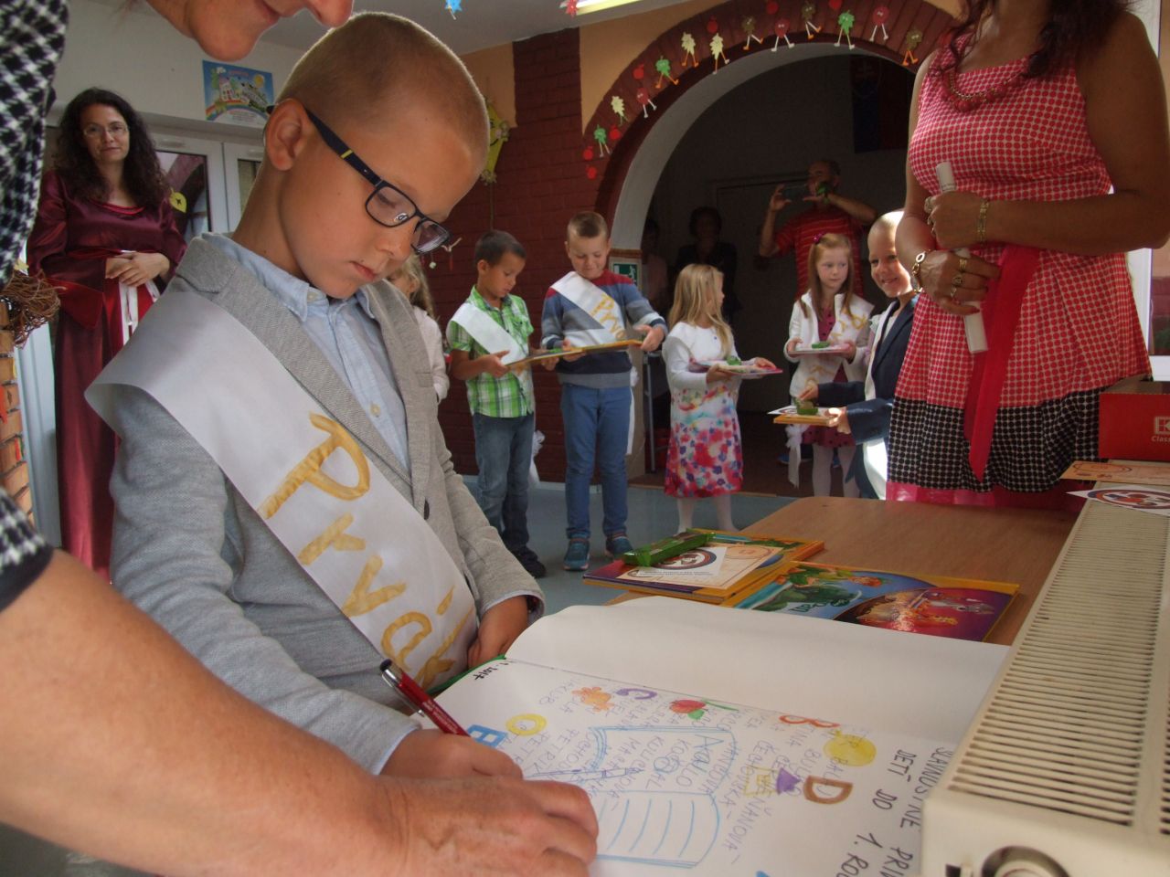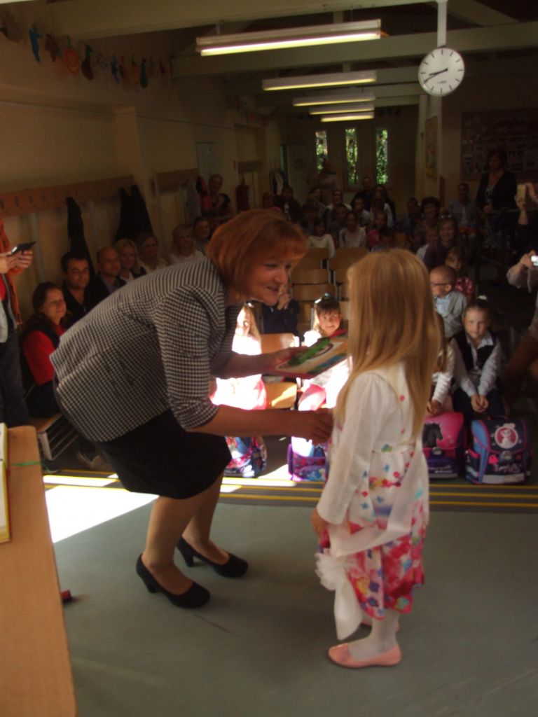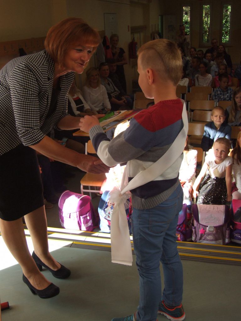 Nová pani riaditeľka v príhovore predstavila seba, učiteľský zbor a nových žiakov – prváčikov. Slávnostným šerpovaním pasovali pani učiteľky deti za prváka alebo prváčku. Každému prvákovi pani starostka odovzdala darček od obecného úradu - knižku s venovaním a sladkosť. Podpisom do pamätnej knihy deti ukázali, že už naozaj patria medzi školákov.