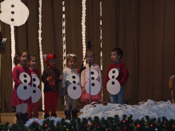 Ako prvé vystúpili menšie deti z materskej školy. V milých kostýmoch snehuliakov nám pripomenuli zimu a potom ako zvieratká nás preniesli do rozprávky. Ako anjeli nám zaspievali a zatancovali staršie deti zo škôlky. Folklórne tradície a krásne kroje predviedli dievčatá a chlapci - predškoláci. Pani učiteľky s deťmi odviedli veľa práce pri nácviku vianočného pásma, za čo im ďakujeme. Nejednej mamine, či babičke sa vykotúľala slzička dojatia.